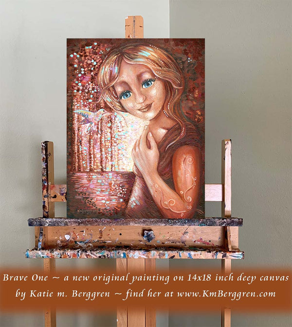 Message from the Artist: An earnest heart & soul, big warm eyes with a soft smile on an open face. She is unafraid to look, to see, with a willingness to gaze and greet and accept. She knows the way, the path forward, it’s just there. Let’s go. Let’s trust. Like a friend, willing to look at you, to see you, to listen. She’ll be brave with you, remind you to tap into your inner resources. Remember your strength. You are not alone. A new original painting from the KmBerggren Studio.