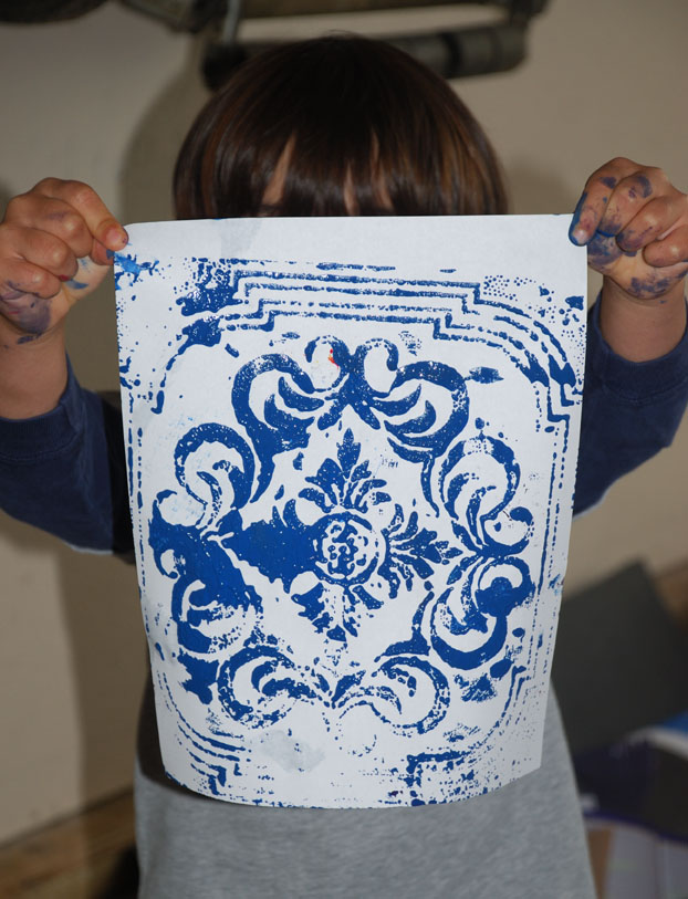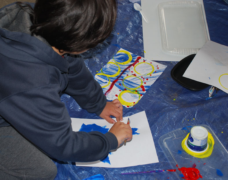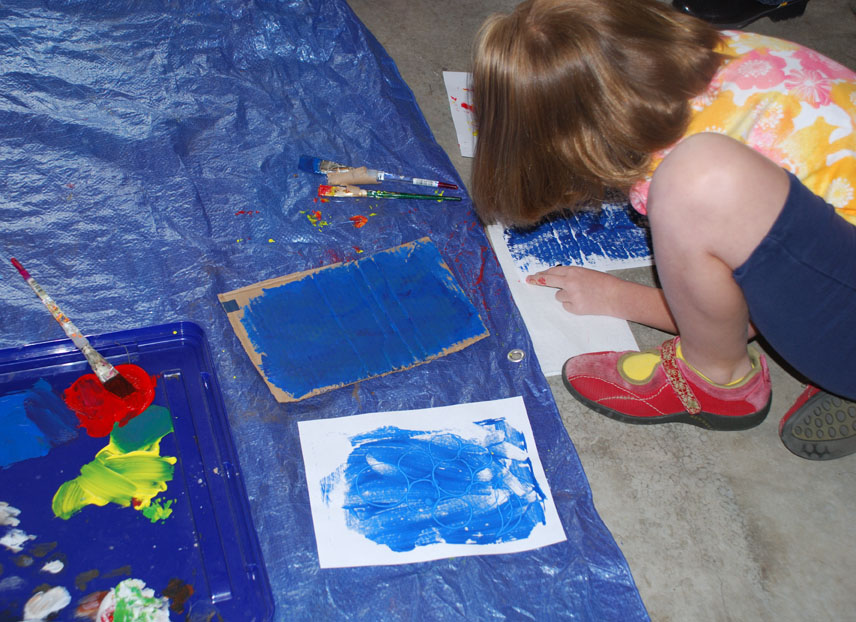 The first event chosen by me (Art of course!) was yesterday afternoon – in my garage – and I had the honor of leading all 17 of our children (age 2- grade 3) through types of printing, using paint, paper and cardboard and a variety of different textured things.