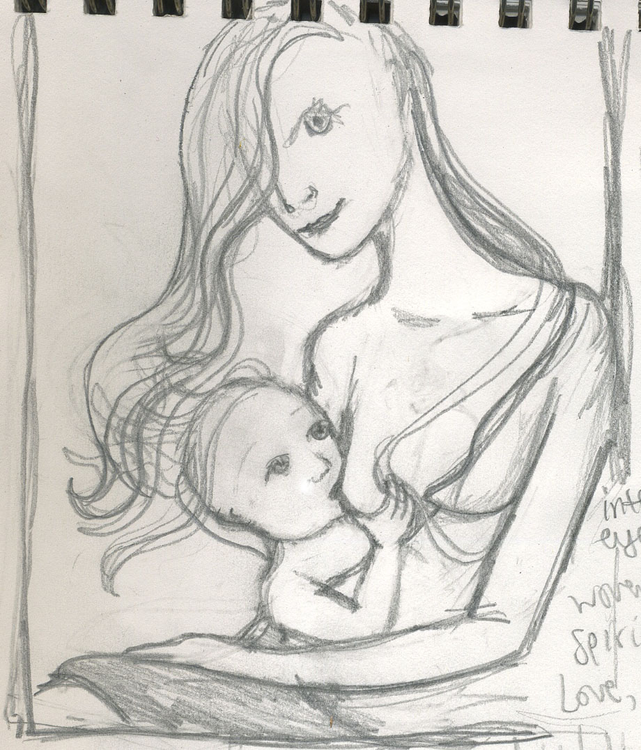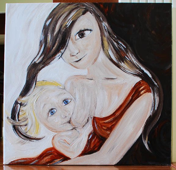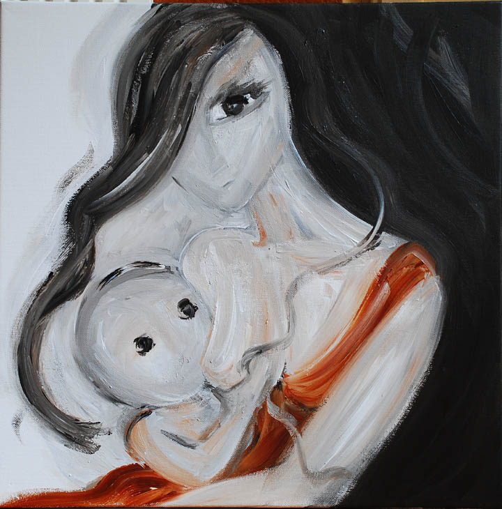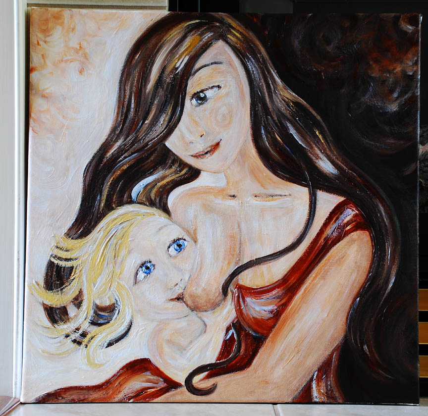 My client for this original painting is a loving mama who was told she could not nurse her 8 week premature daughter when she was born. She held on and worked hard to move her little one from bottles to breast and achieved success at 2 1/2 months. Now at 26 months her vibrant and healthy little girl continues to receive comfort and nourishment ~ and strengthen a bond ~ at her mama’s breast. Thank you A.L.!