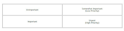 I’ve decided to try a new way of organizing my to-dos. Versus categorizing them by business/research/contacts/personal/etc etc, I am categorizing them using the chart above. Using one brightly colored sticky note on each quadrant.