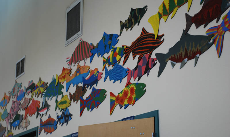 The finished fish were great ~ and they soon joined (within a few days) their friends painted by students-past within the great school of fish ~ on the walls of the pod.